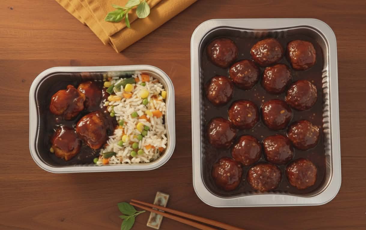 Petites boulettes de poulet bien assaisonnées, nappées de notre sauce maison général Tao, le tout servi avec un riz aux légumes.