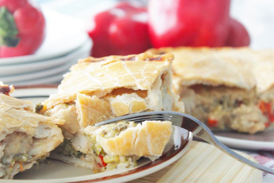 Ingrédients: Pâte brisée (Farine de blé, shortening (canola, huile de palme, huile de palmiste modifié, eau, dextrose, sel, fécule de maïs, bicarbonate de sodium, propionate de sodium, sulfites), poulet , bouillon de poulet, poireaux, carottes, pois verts, céleris, crème, farine, margarine (soya), ail, sel, poivre. Dorure: lait, oeufs.